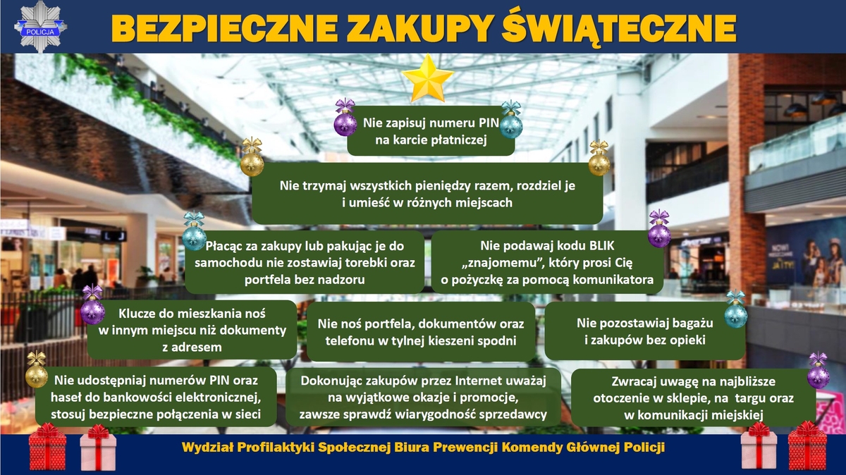 Zbliżający się czas Świąt Bożego Narodzenia to okres intensywnych przygotowań, podczas których często towarzyszy nam pośpiech i roztargnienie. Te okoliczności są idealne dla przestępców, którzy korzystając z naszej nieuwagi, próbują skusić nas na „tańsze zakupy” lub używając manipulacji, pozyskują od nas dane poufne, przy użyciu których dokonają transakcji „w naszym imieniu”. Nie zapominajmy również o tym, że nadal powszechna praktyką są kradzieże kieszonkowe zwłaszcza w dużych skupiskach ludzi takich jak galerie handlowe czy bożonarodzeniowe jarmarki.