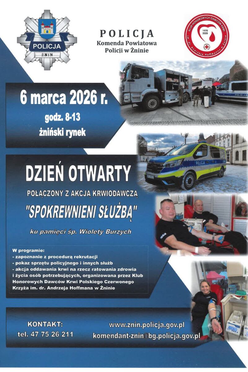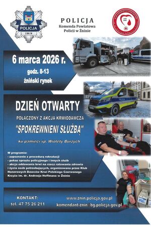 „Dzień otwarty” połączony będzie z akcją honorowego oddawania krwi „Spokrewnieni Służbą”, organizowaną przez Klub Honorowych Dawców Krwi Polskiego Czerwonego Krzyża im. Dr. Andrzeja Hoffmanna w Żninie. Inicjatywa odbywa się ku pamięci śp. komisarz Wiolety Burzych. Oddana tego dnia krew pomoże w ratowaniu zdrowia i życia osób potrzebujących.