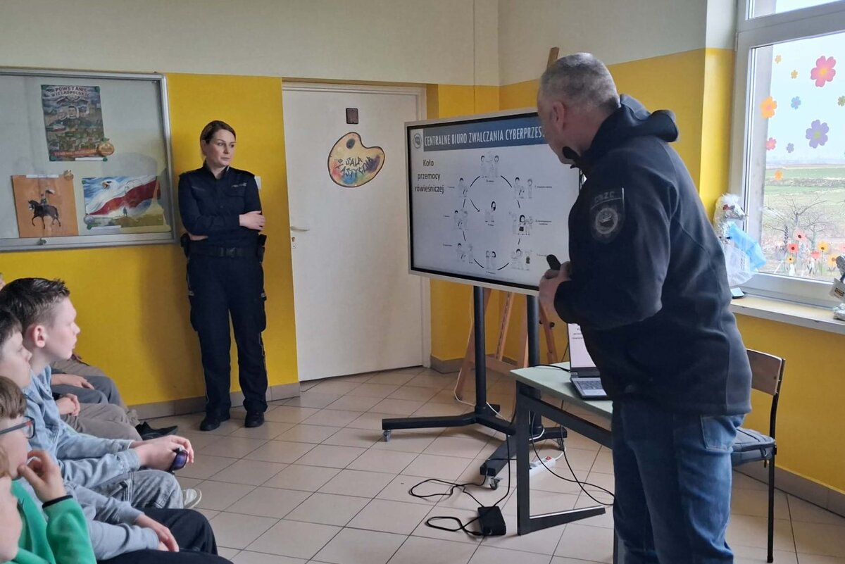 W piątek (20.03.2026), podczas spotkania z młodzieżą w szkole w Gąsawie policjanci z Komendy Powiatowej Policji w Żninie oraz Centralnego Biura Zwalczania Cyberprzestępczości w Bydgoszczy omówili kwestie związane z aktywnością w Internecie. Wskazali, na co zwracać uwagę w codziennym korzystaniu z sieci oraz jak właściwie reagować w sytuacjach budzących niepokój.