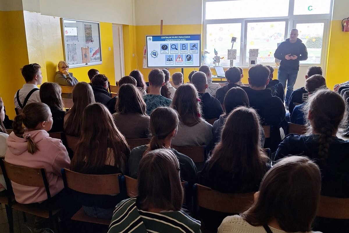 Podczas prelekcji funkcjonariusz zapoznał uczestników z zakresem działań realizowanych przez Centralne Biuro Zwalczania Cyberprzestępczości. Wyjaśnił, jak wygląda ich praca oraz w jakich sytuacjach podejmowane są działania wobec osób naruszających przepisy prawa w sieci.